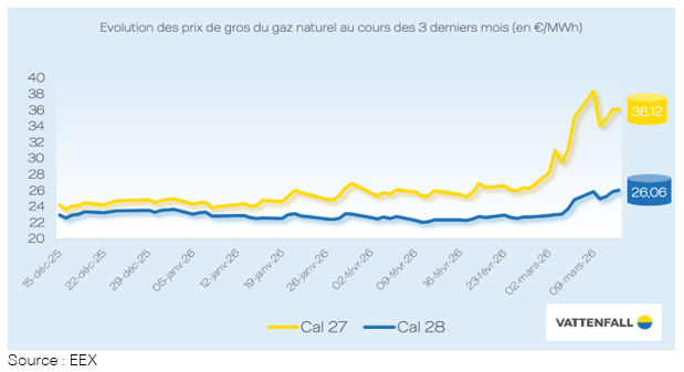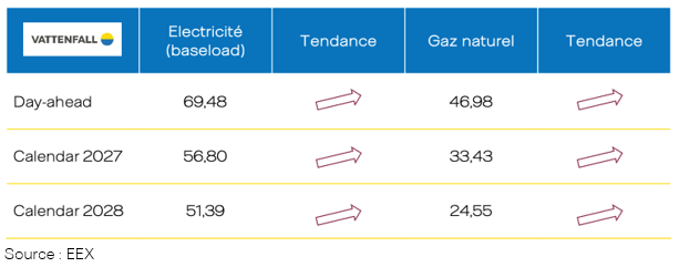 Le prix des contrats à terme est également en forte hausse : +7,33 €/MWh pour le contrat calendaire 2027 et +1,94 €/MWh pour le contrat calendaire 2028.