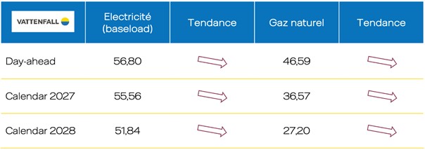Les prix à terme ont également baissé. Le contrat calendaire 2027 a perdu 1,75 €/MWh et le contrat calendaire 2028 0,21 €/MWh.