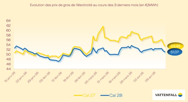 Le prix des contrats à terme a suivi la même tendance avec un repli de 5,50 €/MWh pour le contrat calendaire 2027 et de 2,12 €/MWh pour le contrat calendaire 2028.