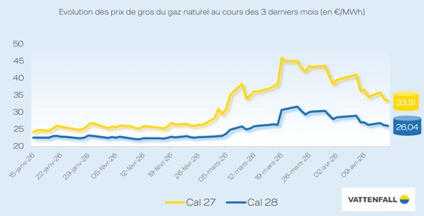 Cette baisse de plus de 14% s’explique par l’annonce, le 8 avril, d’un cessez-le-feu en Iran et de l’ouverture de négociations. Le marché gazier européen demeure néanmoins toujours sous tension. Ce cessez-le-feu est temporaire (deux semaines) et le détroit d’Ormuz reste largement bloqué. De plus, l’ENTSOG, l’organisation européenne des gestionnaires de réseaux de transport, a appelé à remplir les stocks de gaz le plus vite tôt possible. A mi-avril, les stocks de l’UE sont remplis à 30% et les stocks français à 26%.