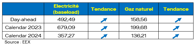 Les inquiétudes sur l’approvisionnement en électricité du pays dans les prochains mois se sont amplifiées et les prix à terme ont flambé. Le prix du contrat calendaire 2023 a bondi de 224,11 €/MWh en un mois tandis que le prix du contrat calendaire 2024 a enregistré une hausse de 111,39 €/MWh.