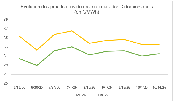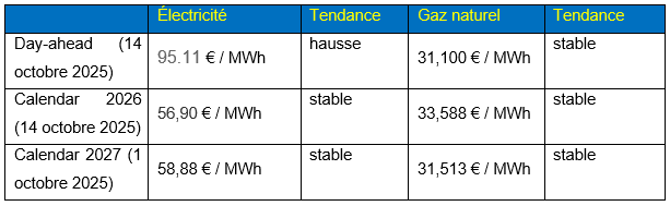 De leur côté, les prix du gaz restent stables. Cette stabilité est permise grâce au remplissage des stocks de gaz à plus de 90 % en octobre 2025. Sans compter qu’à l’inverse du parc de radiateurs électriques, les chaudières à gaz n’ont pas forcément été remises en route. Traditionnellement, elles le sont aux alentours du 15 octobre et jusqu’à la mi-avril. Les prix du gaz pourront donc fluctuer davantage sur les marchés spot dans les semaines qui viennent.